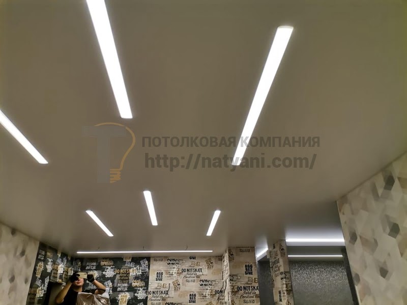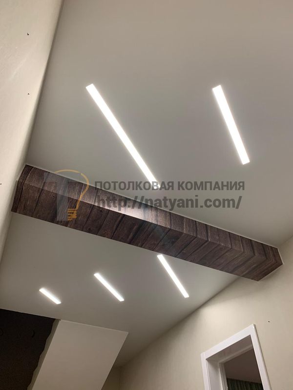 При необходимости потолок можно дополнить современным освещением. Мы устанавливаем точечные светильники, декоративную светодиодную ленту и реализуем решения из раздела натяжных потолков с подсветкой. Это позволяет создать мягкий свет, подчеркнуть интерьер и сделать помещение более уютным.